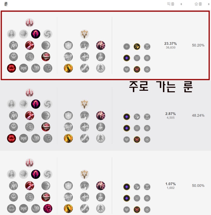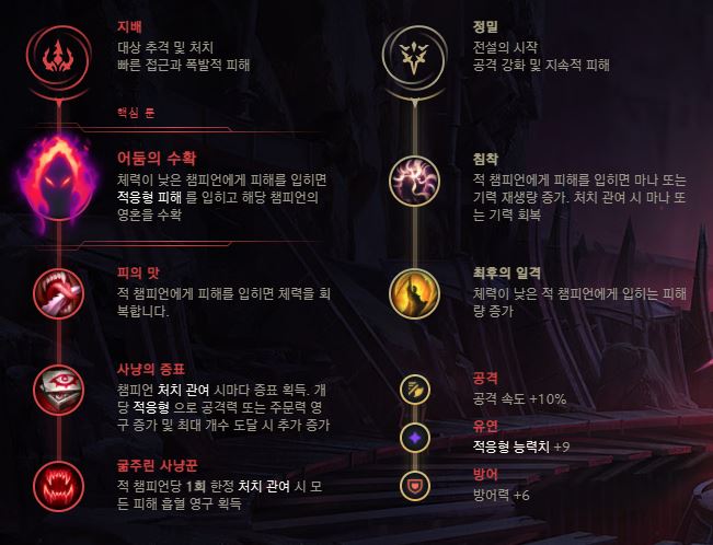 룬 이제 날카로운 바람의 코르키 룬에 대한 정보를 확인해 보겠습니다. 주요 룬은 지배, 어둠의 수확, 피의 맛, 사냥꾼의 증표, 보물사냥꾼 순으로 선택해 주시기 바랍니다. 그리고 보조 룬으로 정밀, 평온, 최종 타격을 사용할 수 있습니다. 능력 조각의 경우 공격 속도 – 적응 능력 – 성장 체력을 인쇄합니다.