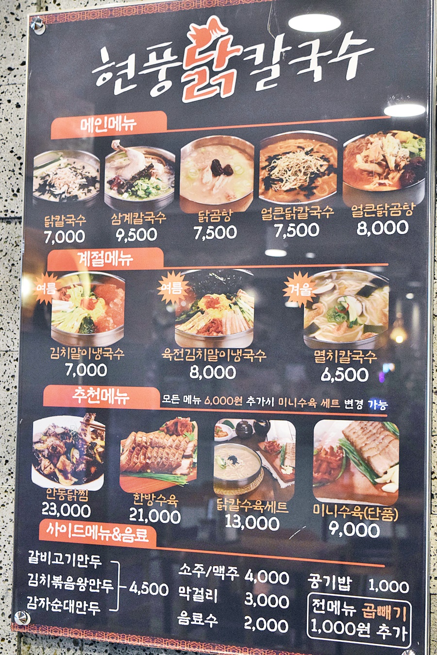 현풍달칼국수에서 닭곰탕을 자주 먹는 이유는 가격이 합리적이기 때문이다. 한 그릇에 7,500원입니다. 이 가격이면 저렴합니다. 요즘 7,000원 ​​전후로 이렇게 푸짐하고 영양가 있는 음식을 먹기가 쉽지 않은 것 같아요. 치킨칼국수가 7,000원이라 가격대비 괜찮은 곳입니다.