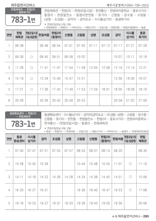 새롭게 변경된 제주읍면지선 버스 783-1번 시간표